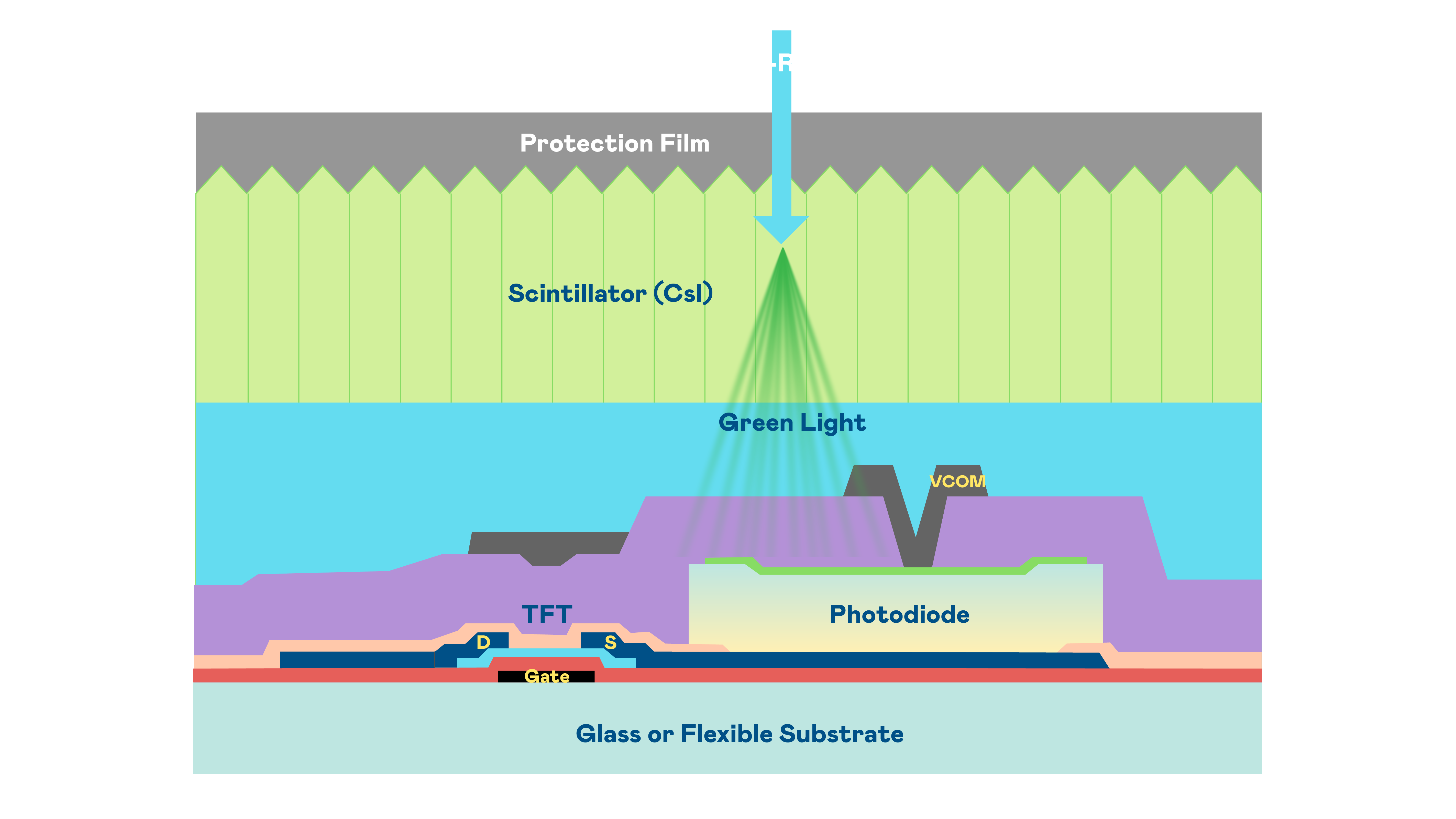 摩斯国际的X光影像感測陣列使用薄膜電晶體 (TFT) 作為每個像素的讀取開關,搭配光電二極體(Photodiode)的光電轉換元件,用以感測X光影像訊號。